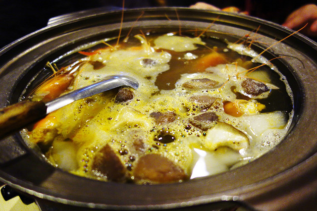 尚青的泰國蝦,放入鍋中烹煮,待蝦身變得火紅,就可以盛起品嚐,直接品嚐或是再搭配哇沙米都有不同的滋味;蝦鍋內還有白蘿蔔與香菇等食材熬煮,煮的時間越久,湯頭滋味越是鮮甜,和著濃郁的蝦味,著實就是一道扎實的海鮮鍋。
