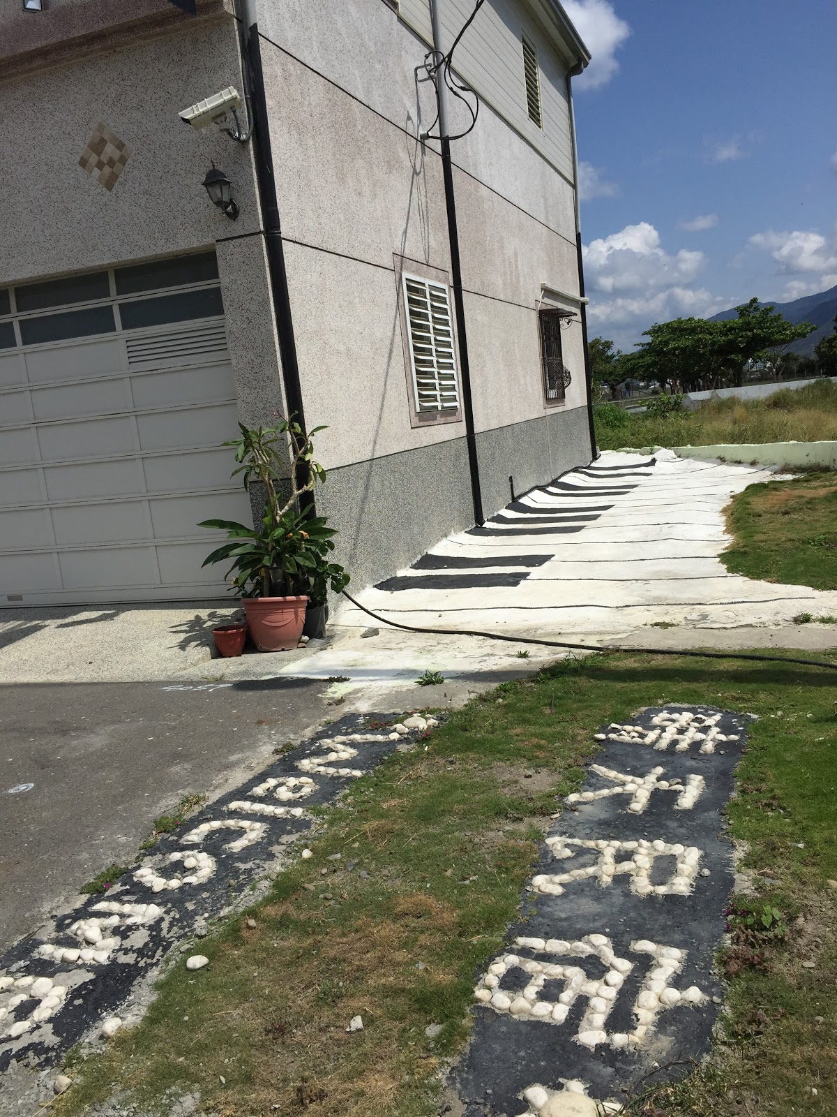 | 民宿外牆,很可愛的設計喔! 很用心的歡迎標誌,也把建築物融合了音樂的元素進去! |