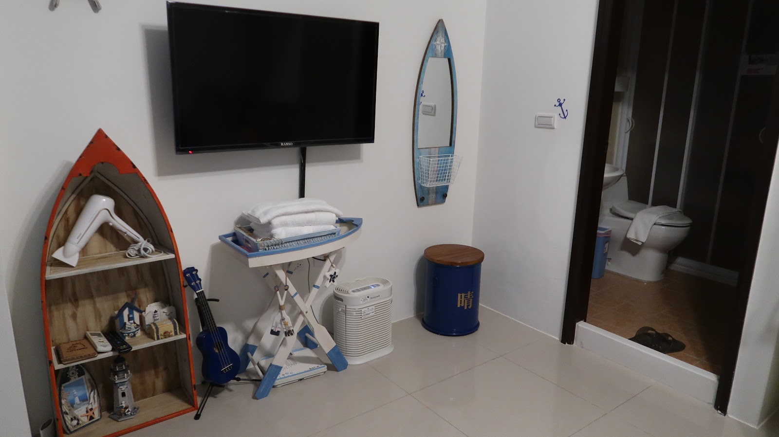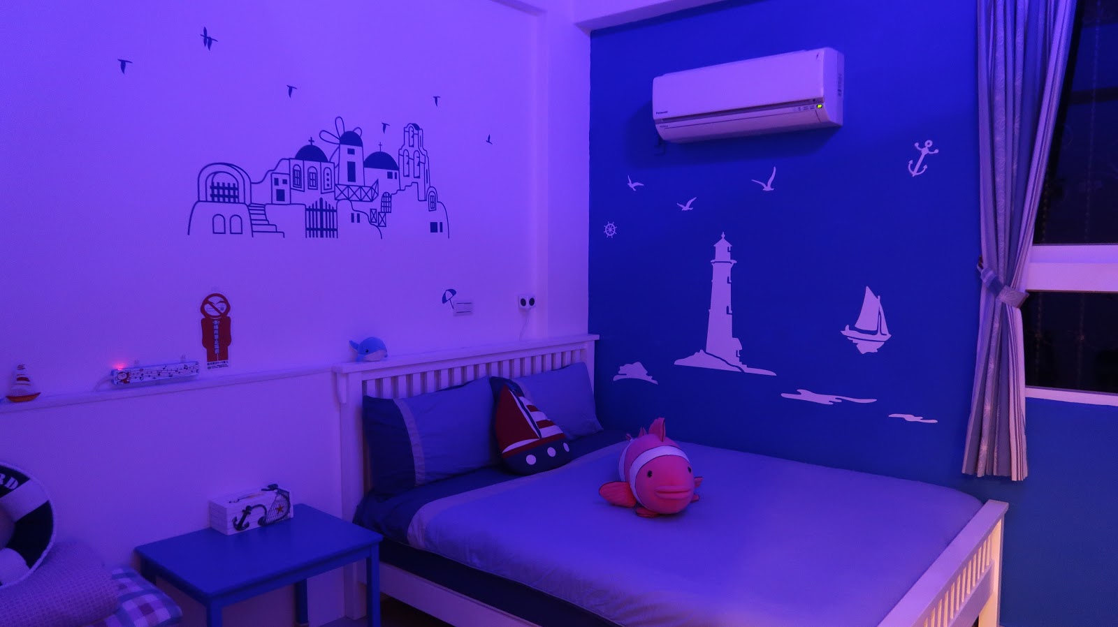 這間是三樓的「仲夏之夜」,和名字比較不搭嘎,因為房間走的是海洋水手風! 喜歡海洋的我們,很喜歡這間的佈置! |