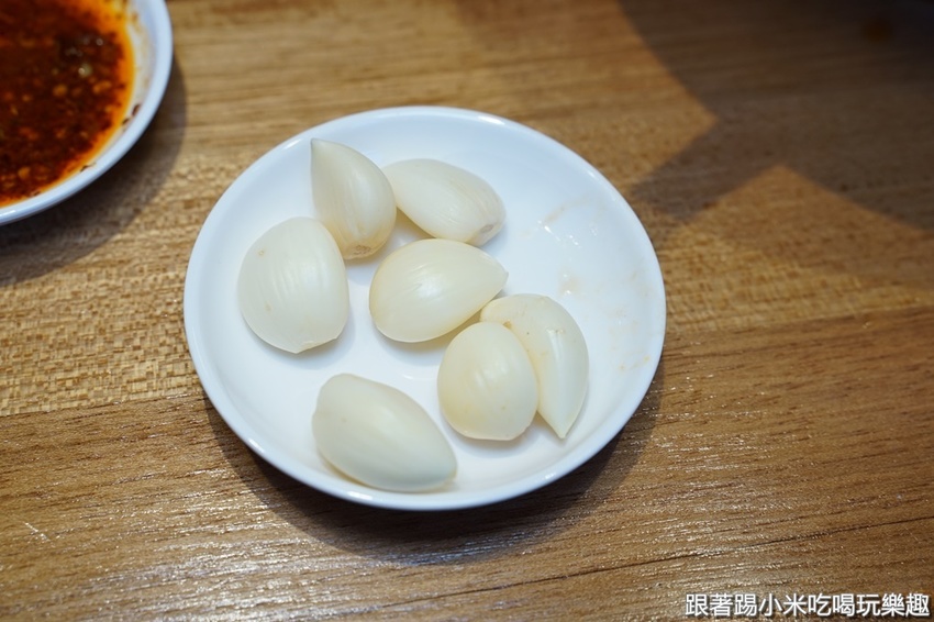 店裡的餐具跟調味料都自行取用,其中比較特別的一點是店家自行手工撥的蒜粒,其實現在蒜頭還蠻貴的耶,而且採用本地嗆辣的蒜粒,小米特別跑去問一下店員,店員說這就是以前眷村的時候,大家生病不舒服的時候都會用蒜粒來配,應該是體內消毒殺菌的概念吧