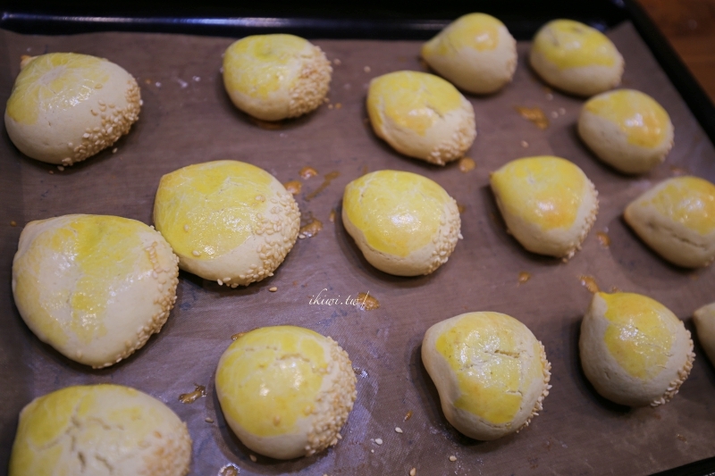底部先沾點水再壓一點芝麻,放烤盤上,接著最後一道程序就是刷蛋液在上面,等等烤出來就會知道,超漂亮的啊!