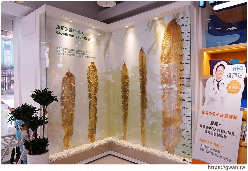 一進到店內,左手邊特別設置一個褐藻展示區,像海帶、昆布、群帶菜、馬尾草都屬於褐藻。大家可能不知道,海帶經過一夜就可以長到50幾公分呦!櫥窗裡2公尺高的海帶雖然已經跟姚明身高差不多,但以實際來說卻是被歸類在嬌小體形,海中最大的海帶居然可以高達60幾公尺