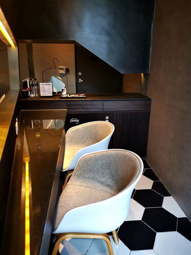 mini吧連結的有兩張座椅的小型書桌,座位面對的是床尾的50吋大電視。