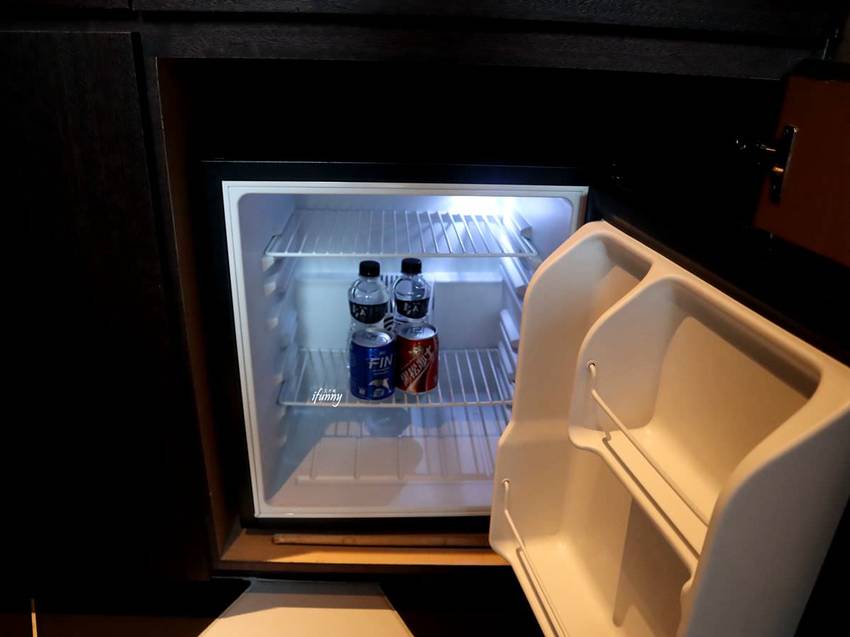 裡頭是無料的飲用水及氣泡飲料。這天我們把晚上要給台中友人的伴手禮也放在冰箱之中,真是綽綽有餘。