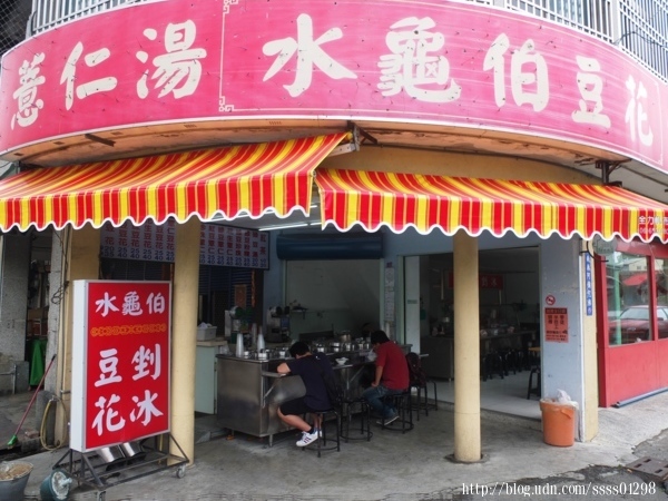 年輕時的水龜伯以製作豆製品維生,而後研發出不含冰塊的冷凍豆花,開始沿著三輪車沿街販售,因為沒有招牌,村裡的人們都直接稱為「水龜伯豆花」,小小名聲漸漸傳了開來。儘管現在有了店面還是非常傳統,不僅有賣豆花系列,這裡還有薏仁湯、綠豆湯和冷飲、剉冰,是鹽水在地人平時消暑喝喝甜湯的前三名之選,也一直是旅遊導覽簡章中必定會出現的鹽水豆花老店。