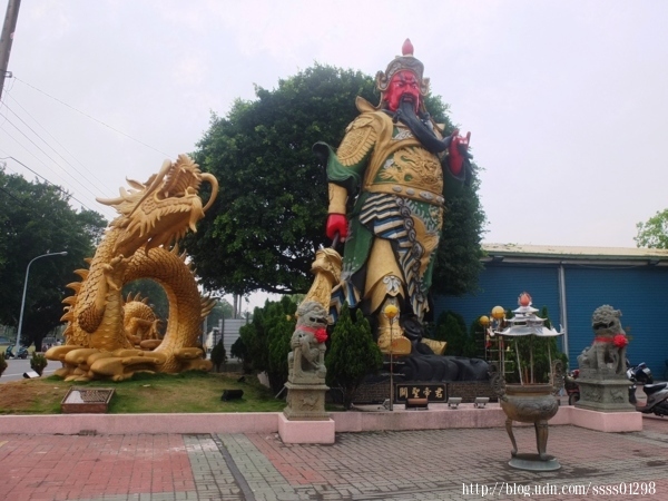 ▲廟前廣場上有一尊高達32尺的關聖帝君像,還有一座長10米、高6米的玻璃纖維之金龍像。