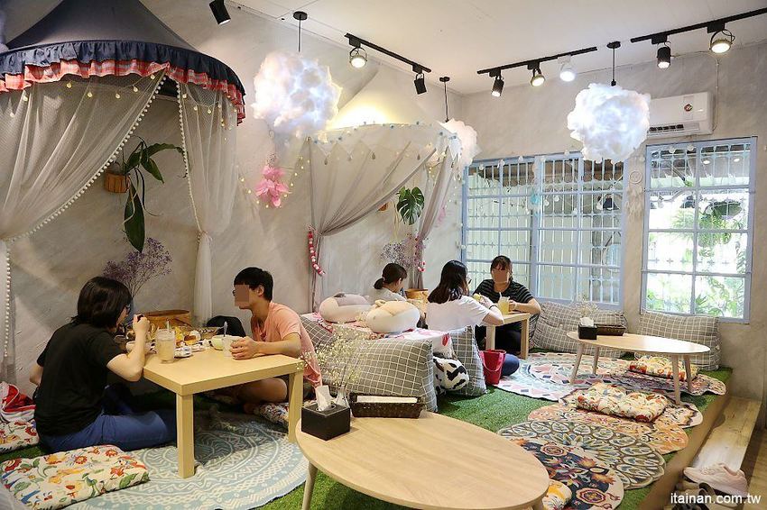帳棚垂掉的紡紗、雲朵燈飾、坐墊還有人工的仿草皮,真的像極了坐在室內野餐阿!!既可愛又好夢幻!是不是不用風吹雨打日曬也能感受到野餐的樂趣呢?