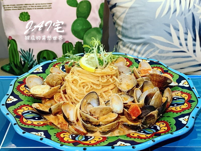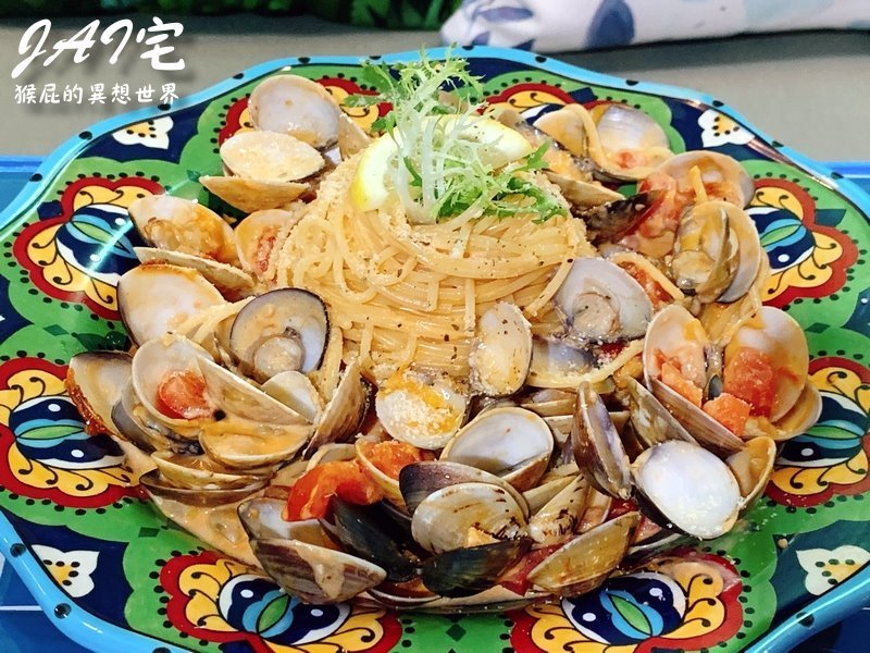 這是我的橘醬爆炸蛤蠣宅宅麵,橘醬是紅醬加白醬,沒加麵就這麼大一盤,分量超級多