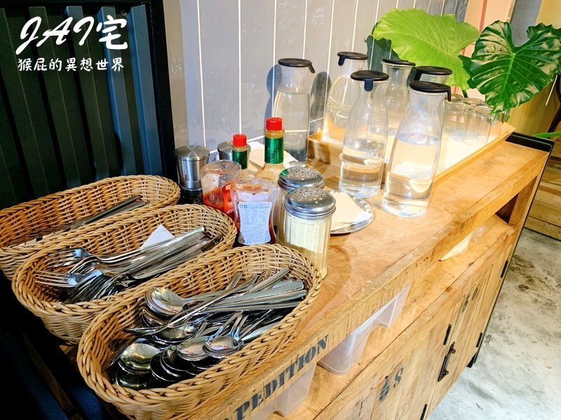 JAI宅沒有收服務費,茶水、餐具自取,有辣椒醬、起司粉、番茄醬等也自行取用