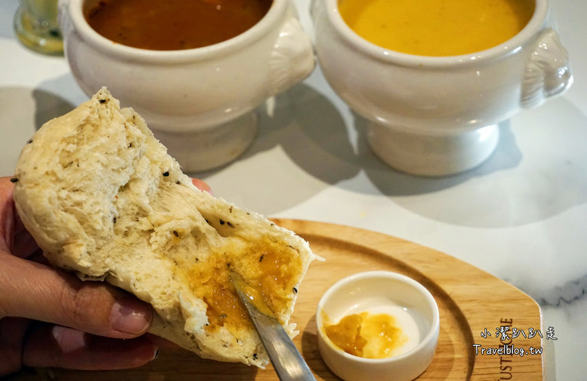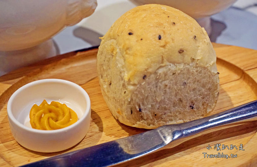 第一道送上的是手工麵包,現點現烤的麵包,有原味、五穀2種口味,一旁還有附上特製沾醬。