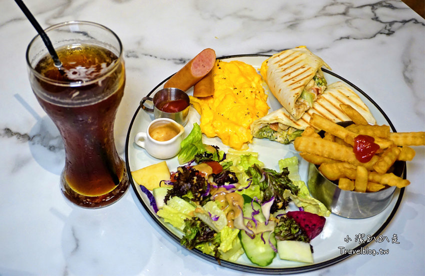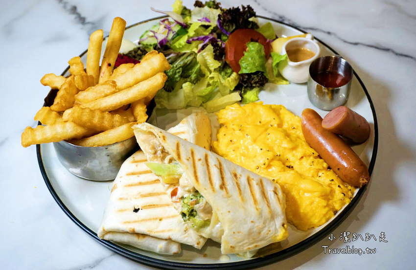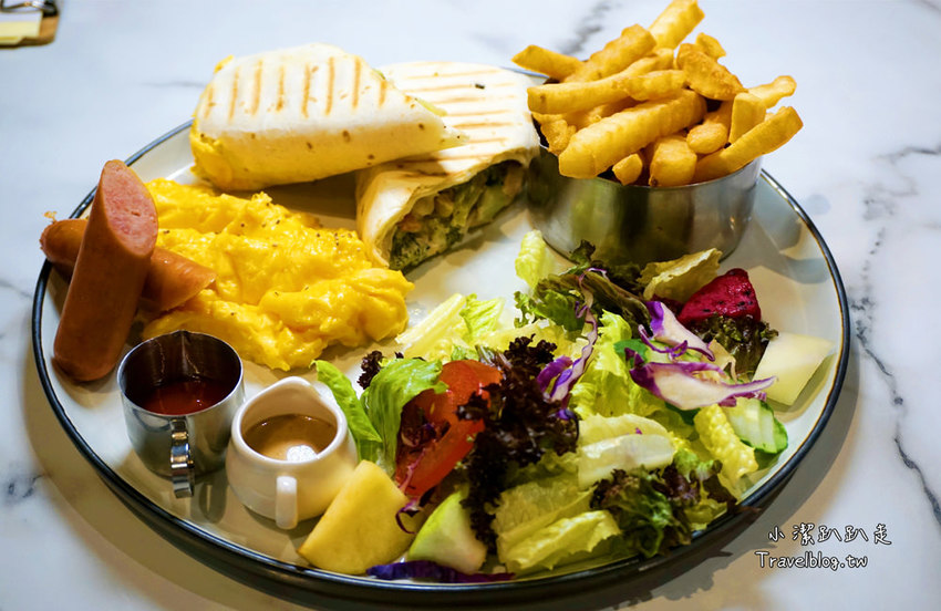 賣相看起來挺讚的,有生菜沙拉、歐姆蛋捲、燻雞烙烙餅、炸薯條、美式香腸、季節水果,內容物也很澎湃呢!