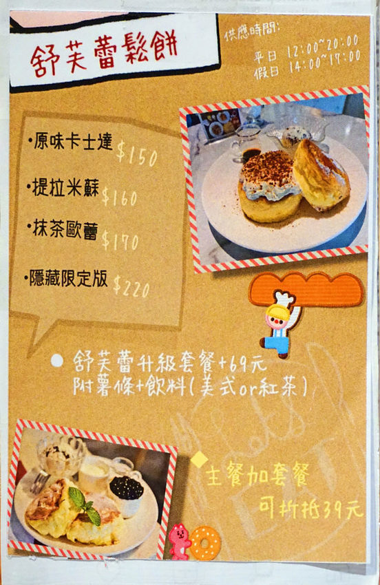 舒芙蕾鬆餅有原味卡士達、提拉米蘇、限定版鬆餅(抹茶歐蕾),另外+$69元升級成套餐,享有薯條與飲料,點選主餐加套餐可以再折抵-$39元,
