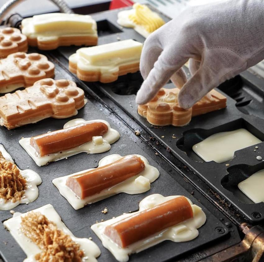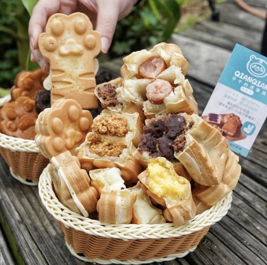 千千的虎掌燒整體來說,口感有別於一般雞蛋糕,它是那種非常Q彈的,會令人驚豔的那種,可以說是麻糬那類的口感😯其中甜食部分蠻喜歡榛果巧克力跟酥香花生的,帶有顆粒口感層次更顯著,也挺濃郁的,卡士達也不會太甜膩剛剛好👌🏻鹹的部分我喜歡脆皮德腸,德腸很大根,咬下去會噴汁到那種,再來就是莫札瑞拉起司,看看影片牽絲拉的有多長🙀