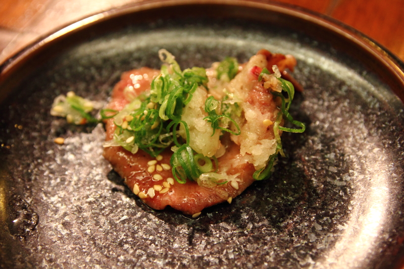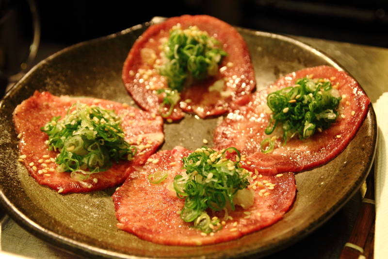 四片牛舌以細蔥花、碎洋蔥加上白芝麻調味。由店員來燒烤以掌握熟度,烤到牛舌邊緣微微翹起成波浪狀,中間仍是粉紅色的便是最佳狀態。