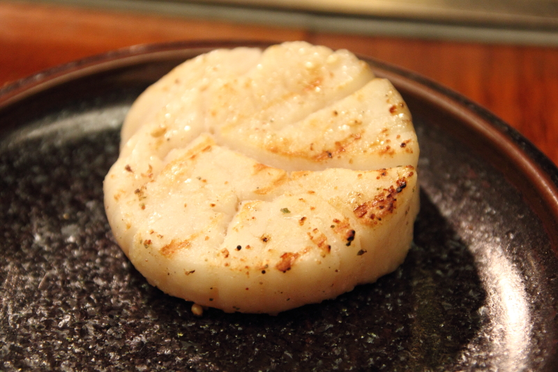 兩面烤至略焦微微裂開,剛好各是熟透約三分之一,中心三分之一仍是生嫩,入口微微焦香的薄硬外表,輕咬下則軟嫩香甜,有著海味的甜美,不過也是調味略淡些,再加點鹽提味會更好。