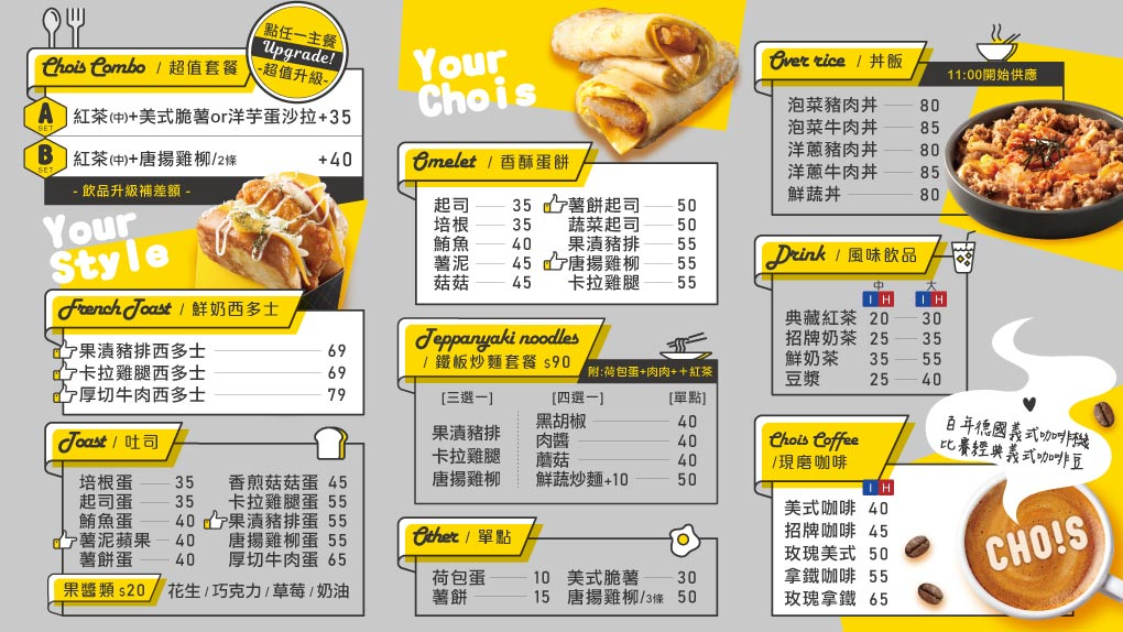 現做的外帶餐點需要等候一點時間,就用丘一司CHOIS 早午餐給你美好的一天吧~