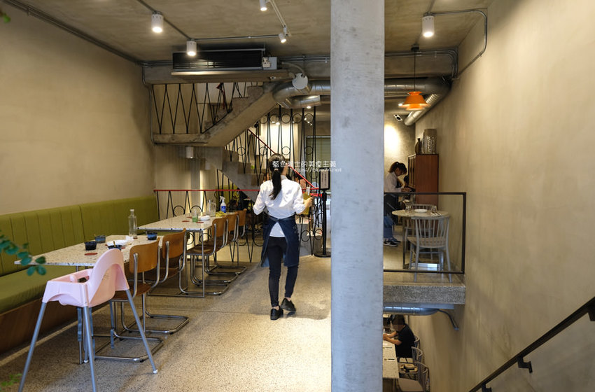 中間區域是4人桌,後方有廁所,保留舊有的樓梯,加以現代化的物件,不違和,有新意帶出特有的店家氛圍。