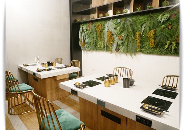 另一邊是包廂位子,有一面綠色植栽網美牆。