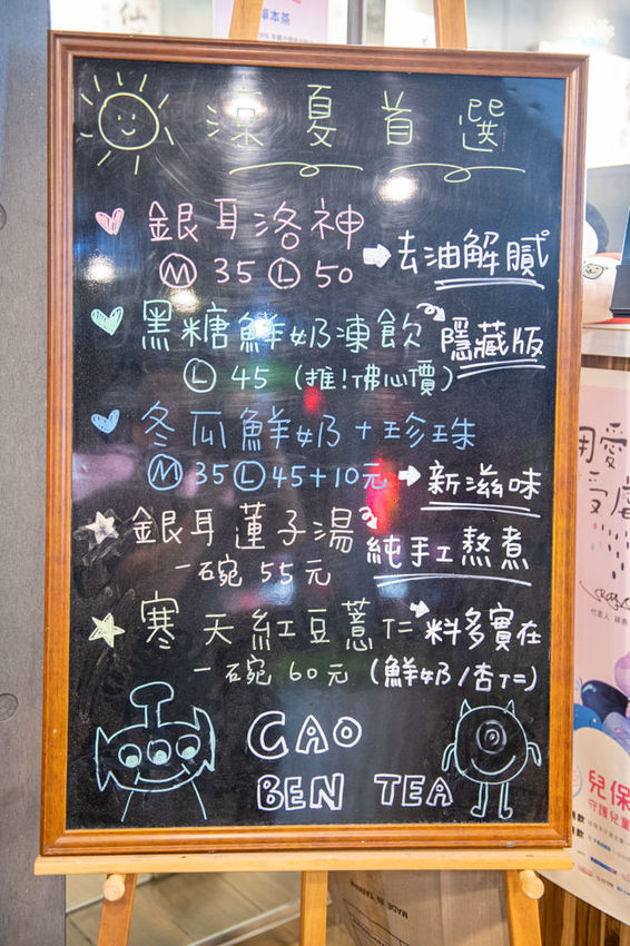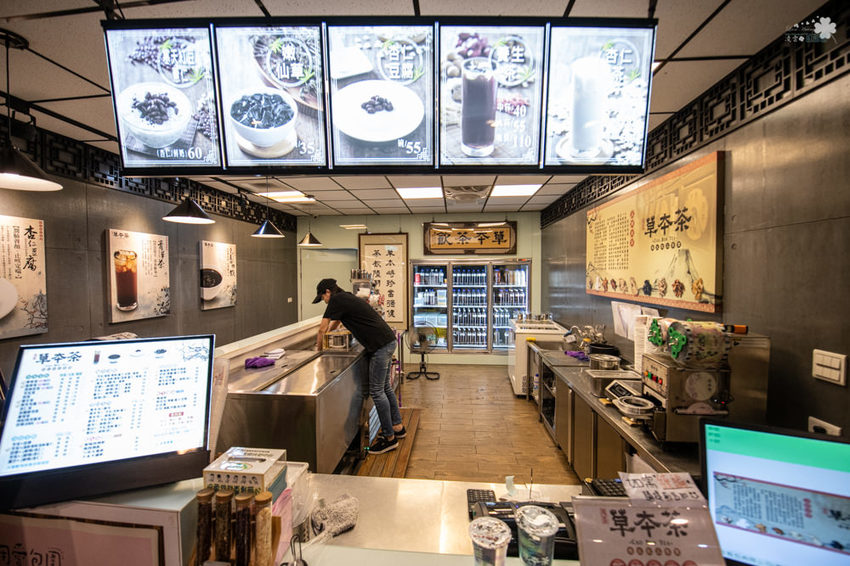 圖|牆上掛著草本茶大推的四種飲品-嫩仙草、杏仁豆腐。