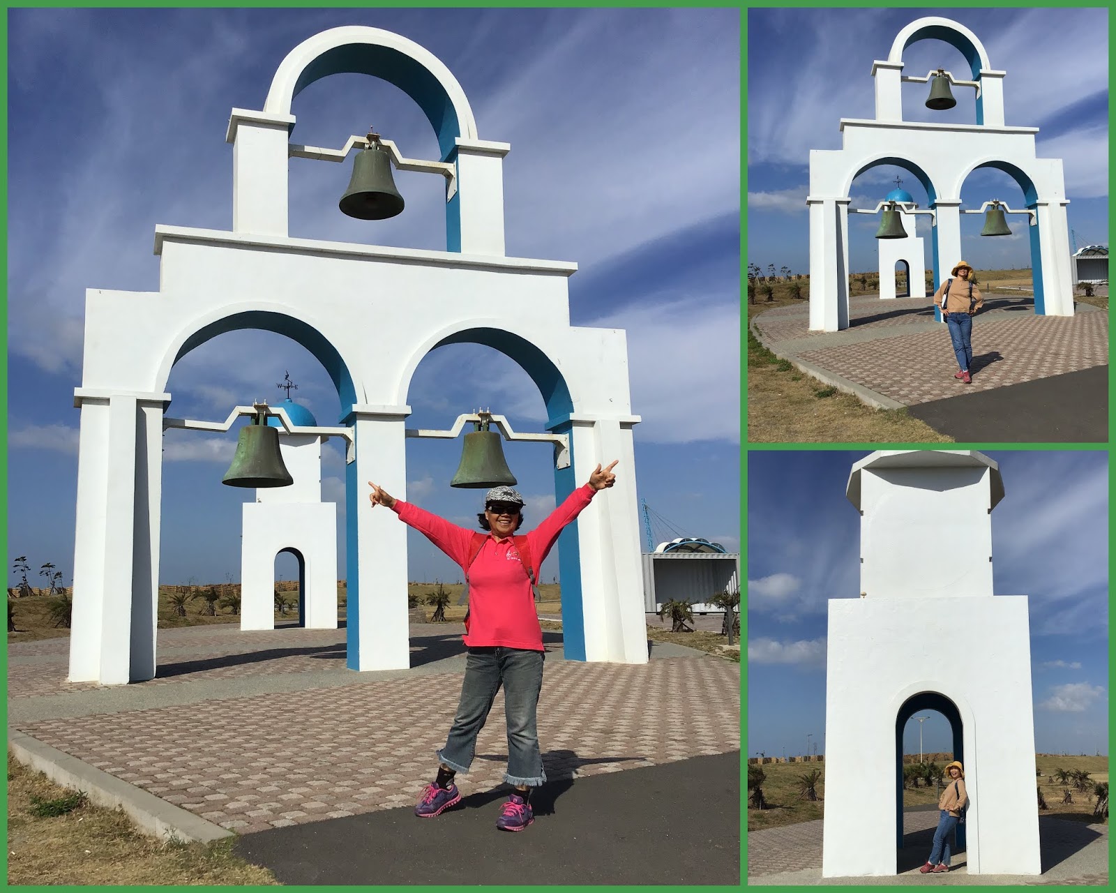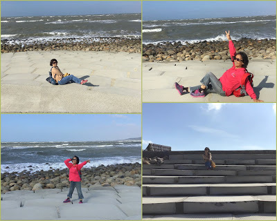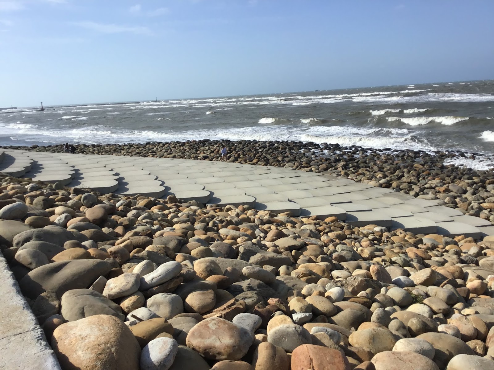 土灰色魚鱗狀的階梯,搭配著藍天碧海白浪,