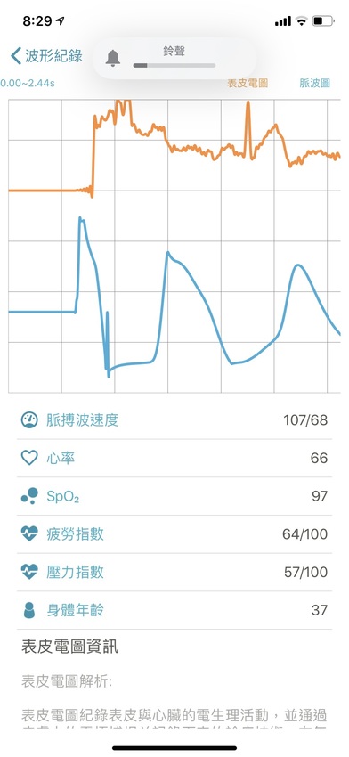 老公測量的數據很健康,指數都很好,除了疲勞 & 壓力指數不正常之外。