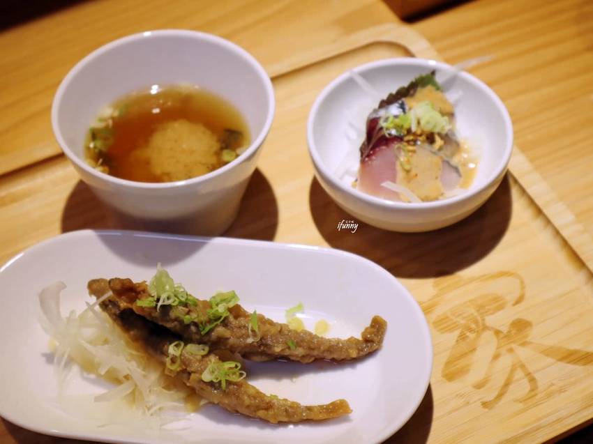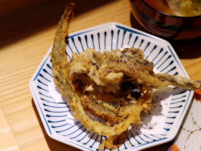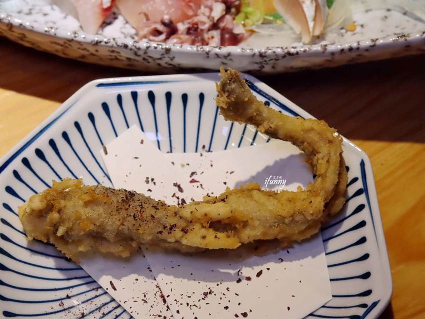 這個也是艾方妮第一次嚐到的魚種,老闆將其裹粉酥炸,再灑上紫蘇鹽。入口的酥脆香氣很討喜,重點是竟連魚骨都能細嚼入口,越嚼越香呢!那紫蘇鹽用得也很巧妙,令炸魚多了清爽感。