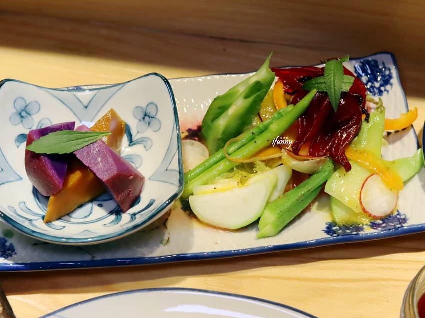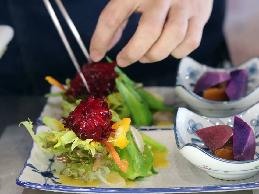 首先由時蔬沙拉做為開場。採佛手瓜、水果甜椒、楊桃豆、野生秋葵、火焰生菜、情人絲瓜、櫻桃蘿蔔、綠蘆筍及洛神花蜜餞,再佐自製芒果沙拉醬。從這些不常見的蔬菜及特製手工醬汁,就可以嚐到主廚的用心,不只一般美生菜加上美乃滋那樣的隨性。