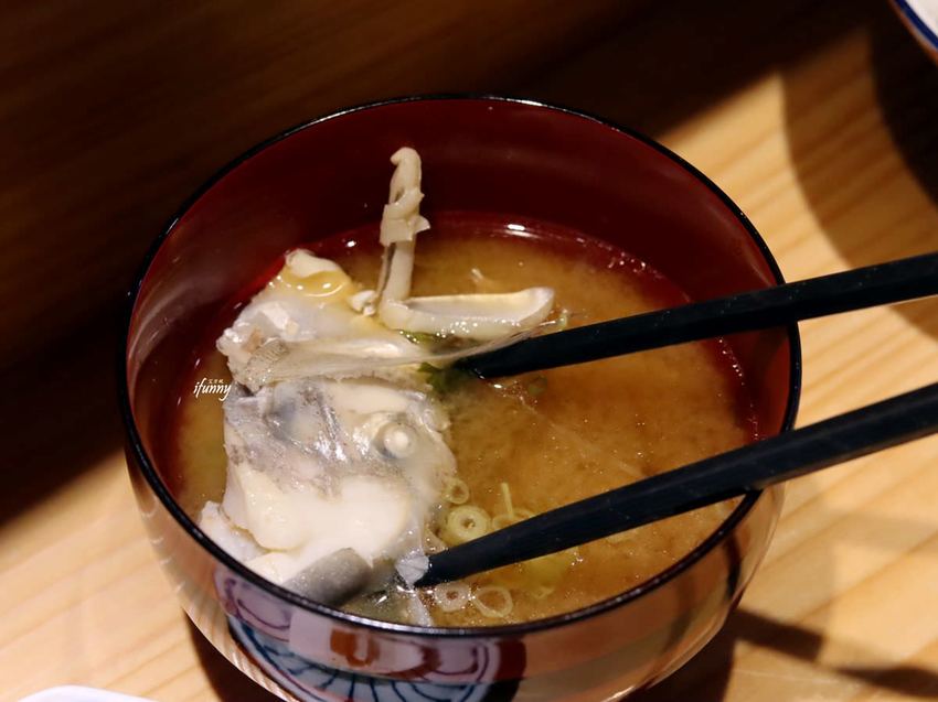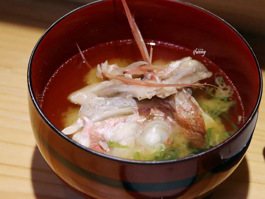 在前面生魚片吃到盤仔魚刺身,肉質細嫩且魚皮帶有柚子香氣。將其魚頭煮成味噌湯,吃得膠原蛋白及鮮甘美滋味。