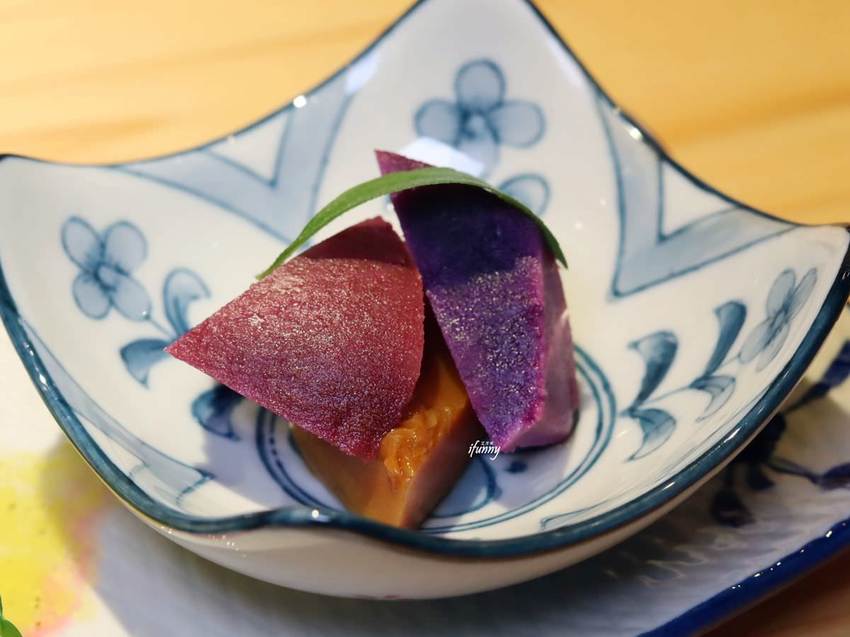 這天的魚是現流白鯧魚、盤仔魚、手釣紅甘&煙仔虎佐柚子胡麻醬及本港螢烏賊。第一次吃到白鯧魚刺身,沒想到是帶著QQ的口感,還有鮮甜滋味,太迷人了!