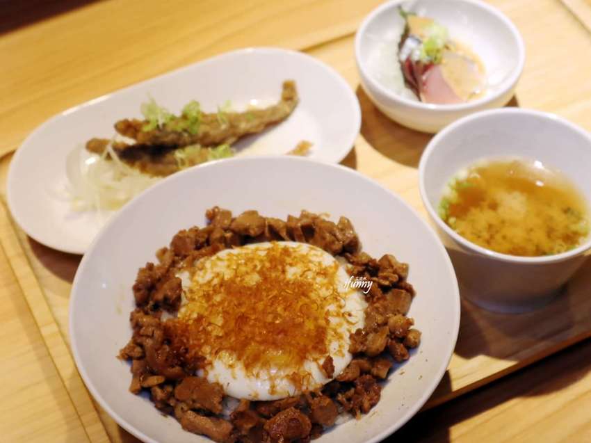 點魚滷飯定食,就會附上柳葉魚南蠻漬、日式味噌湯及時令玫瑰生魚片。