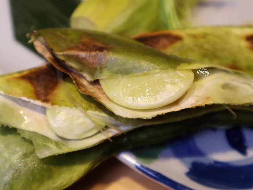 一旁附上的自製百香果南瓜片,微酸甜很好吃,千萬別浪費!