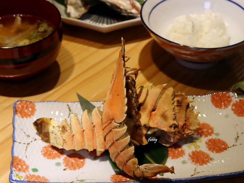 來自宜蘭龜山島海域的深海角蝦,色澤鮮豔。由於角蝦的殼十分堅硬而且每一段都有尖尖的角,老闆指導我們正確的食用方式,是用手指掐住蝦身前後段殼,然後以反方向左右搖擺,蝦殼就可以輕易脫落,蝦肉便會整段順勢而出。而入口後口感鮮甜且具彈性。
