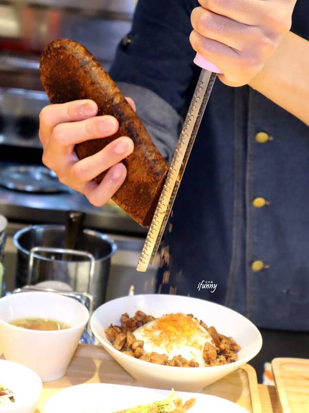 採用台東長濱香米,其上放上一顆很厲害的葉黃素雞蛋製成半熟蛋,再把魚滷肉放得滿滿的,接著大器地現刨烏魚子絲,看起來也太爽快了吧!