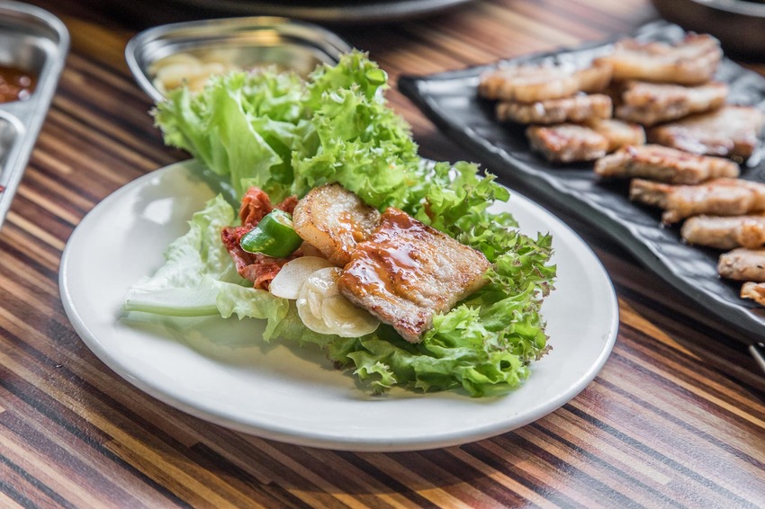 另一種吃法可以包生菜,加上糯米椒、蒜片、泡菜及自己喜好的醬料,用生菜包裹起來一口吃,生菜的爽脆,蒜片、糯米椒辛辣感加上外酥內嫩的五花肉,豐富的層次口感感覺再次重啟味蕾,再多都吃得下!