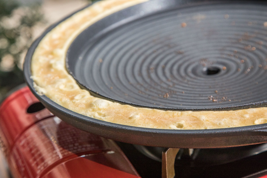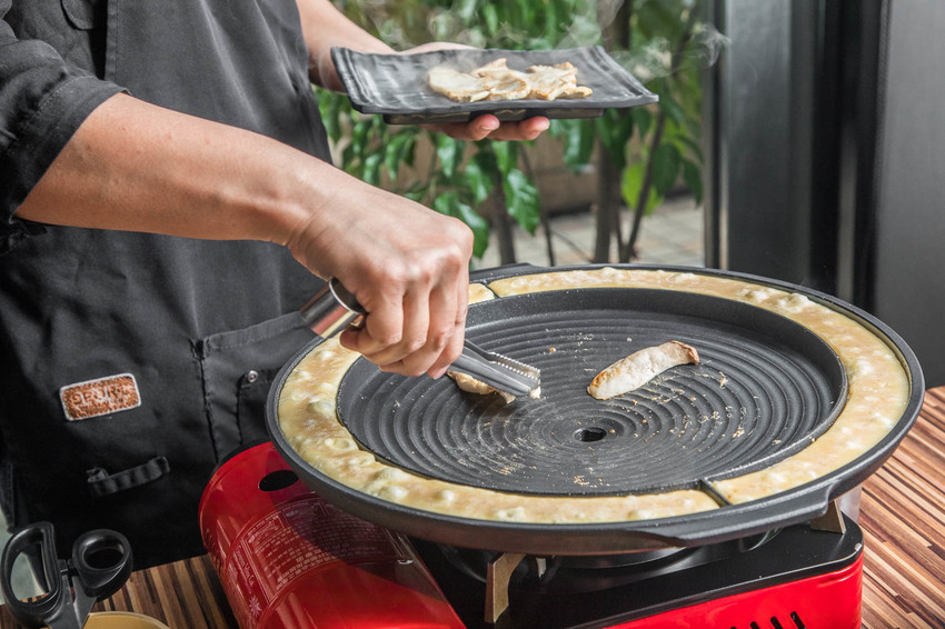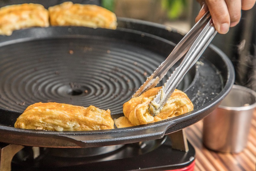 一開始會先料理起士烤蛋,烤爐是圓形的韓式烤爐,旁邊一圈“護城河”已經是先擺上了起士絲,服務生將蛋液倒入,等待蛋液的表面熟成便將蛋捲成蛋捲狀