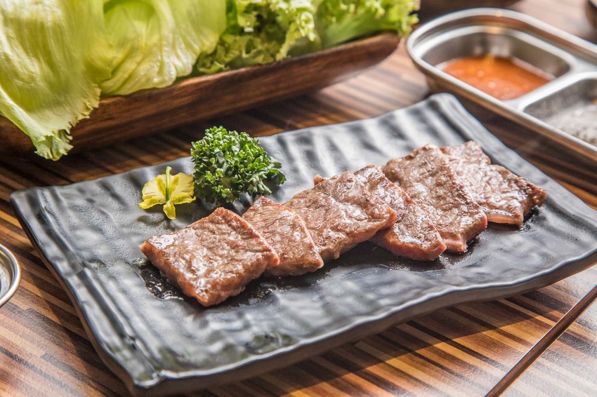 肉盤由左到右分別是:澳洲M9+巧克力和牛板腱、日本A5和牛肋眼蓋、澳洲頂級和牛牛小排,一次排開的頂級和牛,紅豔的肉色上綴滿了雪白細緻的油花,韓舍熟成肉韓式烤肉的肉類皆是用冰鮮恆溫濕式熟成,且熟成時間至少21天!