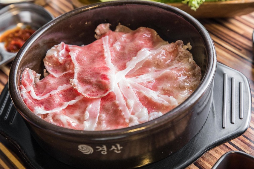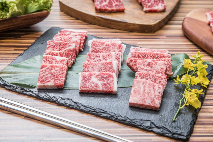 和牛中的夢幻逸品,韓舍熟成肉韓式烤肉是使用佐賀或是熊本的和牛,肉香氣較為濃郁,日本A5和牛肋眼蓋的油脂在室溫下就會融化,上爐烤只要兩面烙一下就可以吃了