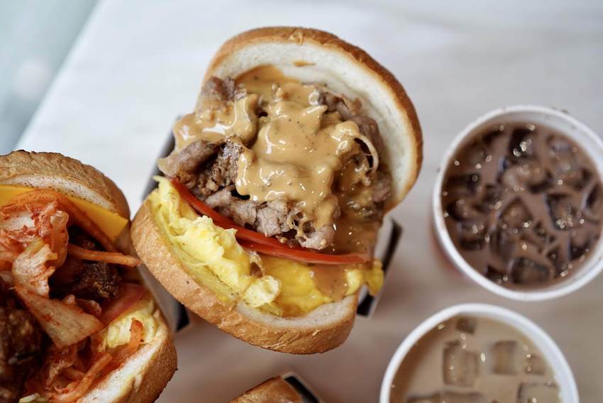 韓式泡菜起司唐揚雞吐司也很浮誇,現炸的唐揚雞肉質鮮嫩又大塊,塞了滿滿的韓式泡菜,微辣的口感越吃越涮嘴,敢吃辣的可以試試,起司片也有加分的效果。