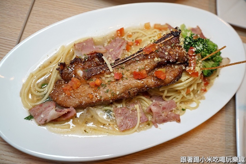 蒜香炒豬肋排義大利麵(259元),哇~這個是應該是肉肉主義者的所喜歡,又有培根又有大片的豬肋排。