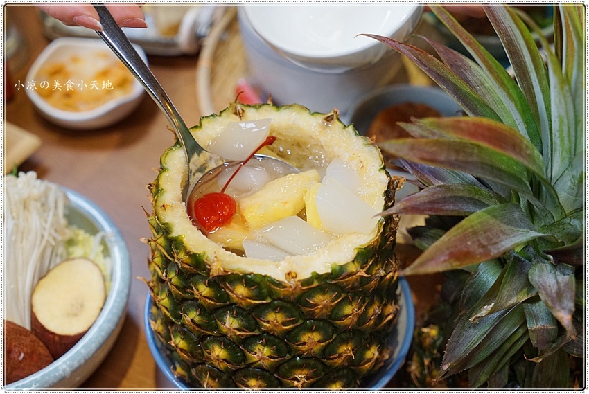 以整顆的鳳梨做容器,裡頭有著脆口的銀耳、鳳梨果肉的酸甜,還有我最愛的估溜杏仁露
