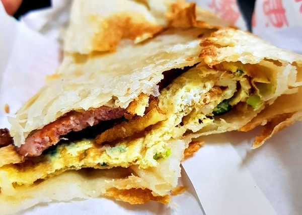 掀開燒餅皮,裡面夾的豬排葱蛋