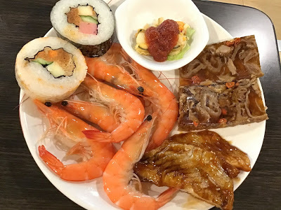 Buffet自助餐台前 有生菜沙拉、熟食區、日式壽司、