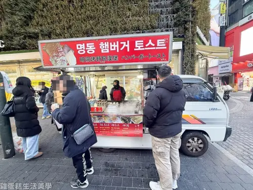 位在明洞的「明洞烤麵包漢堡」厲害到上了不少電視節目,人氣非常高,除了招牌烤吐司外還有販售魚板、飯捲。