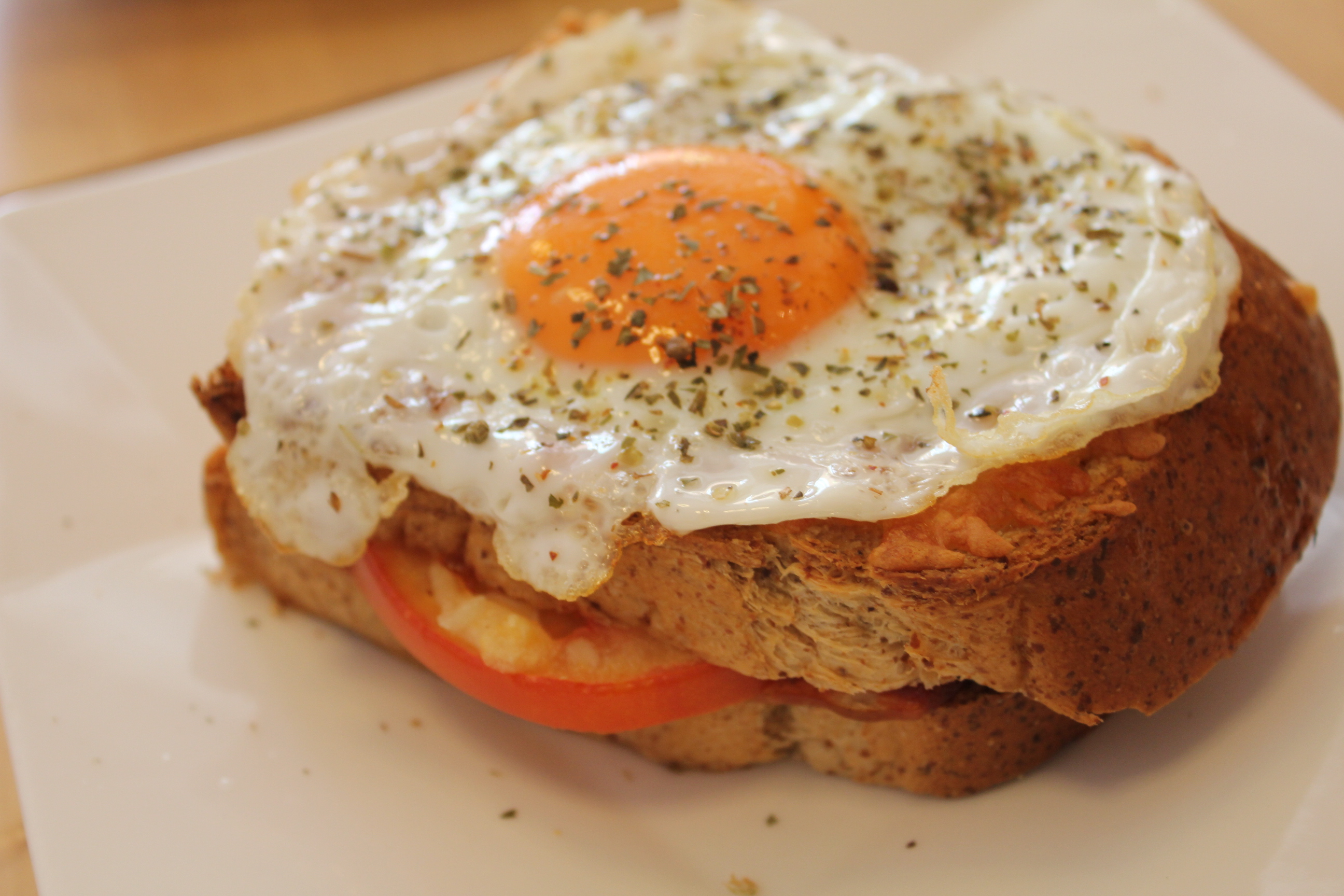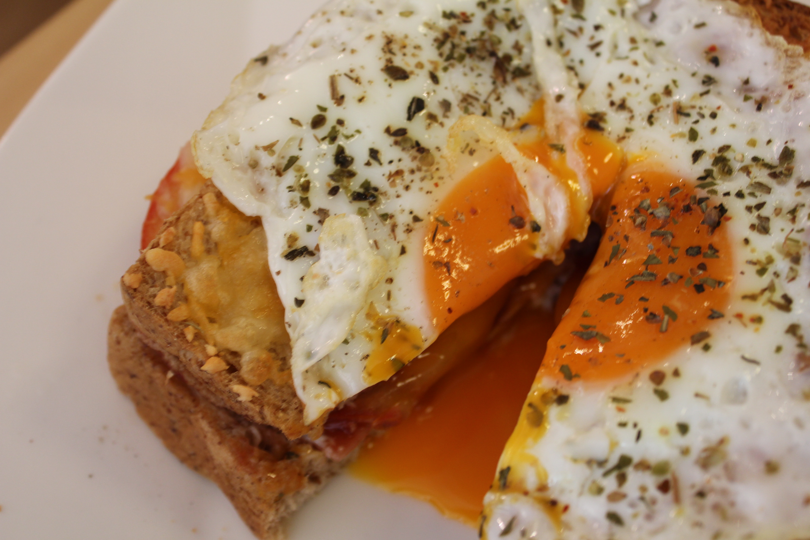 特選的全麥吐司,本身就很好吃了,此時再加上新鮮番茄的內餡與火腿片,還有蛋黃半生不熟的太陽蛋,爽口的滋味,還夾著蛋黃的香氣,看著蛋黃流出來,很過癮,實在有夠讚的!