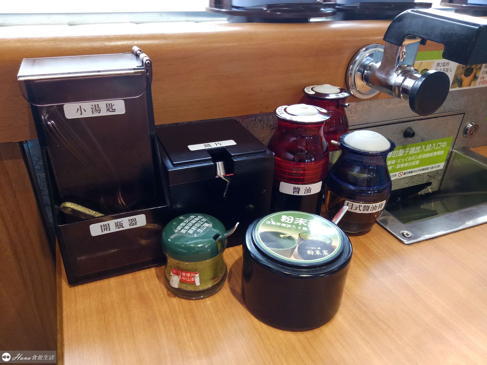 ▲桌面上有放泡茶粉、醬油、生山葵、日式醬油膏、薑片和熱水等可自由使用