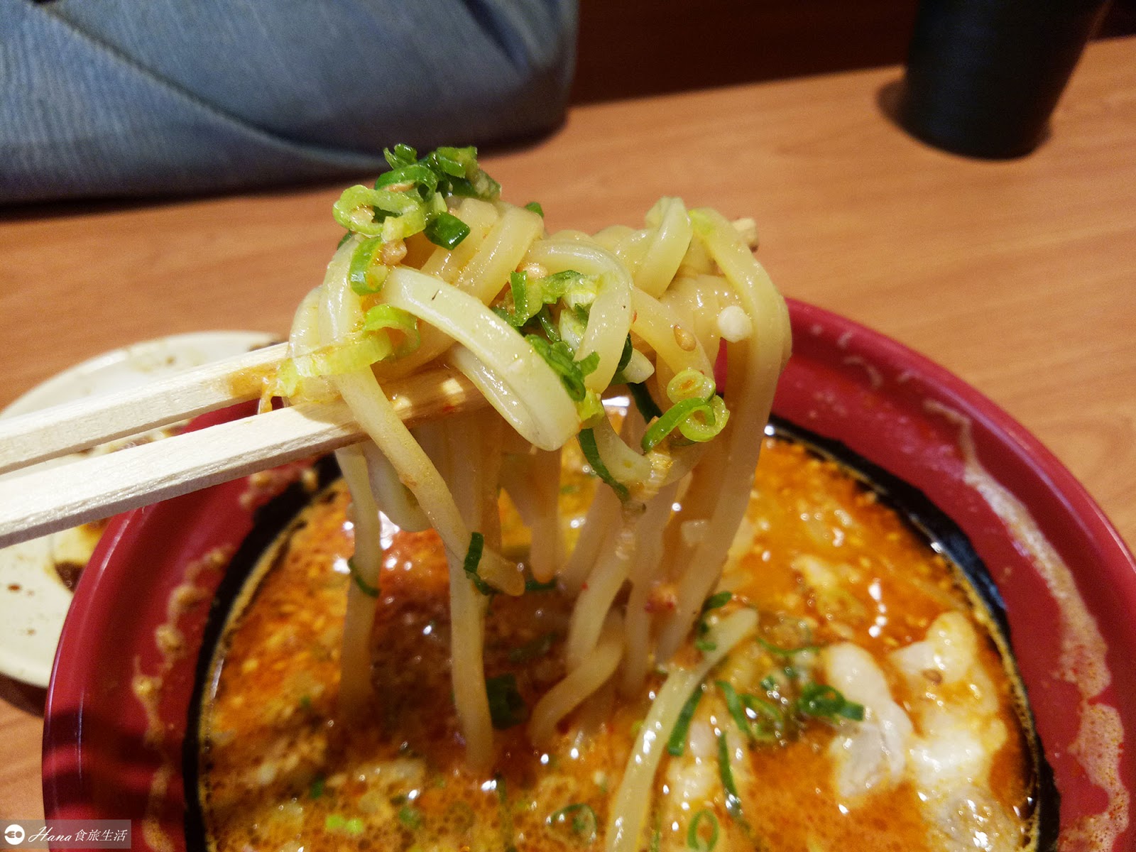 ▲粗拉麵軟Q有彈性,搭配蔥末、白芝麻和沾附一點湯汁入口咀嚼,