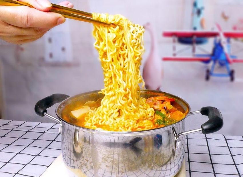 趁剛起鍋趕緊將吸附滿滿部隊鍋湯汁的拉麵夾起來享用