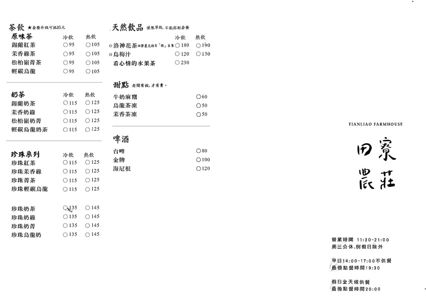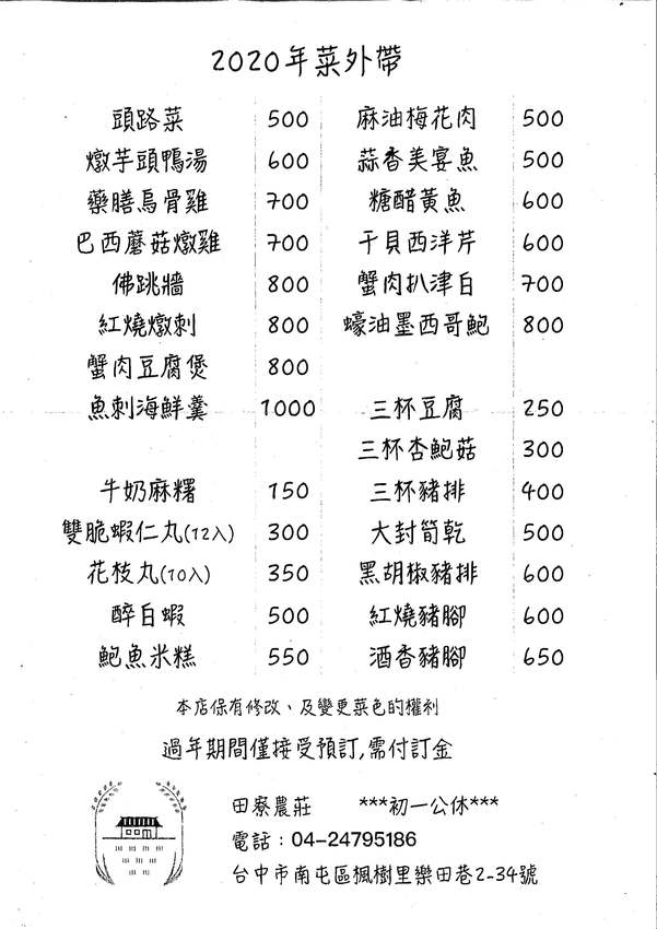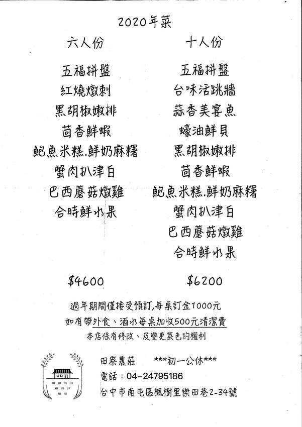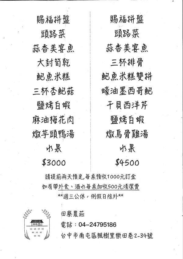 【田寮農莊】桌菜要事先預訂,預付訂金,不收服務費,禁帶外食,如自帶水酒每桌加收500元清潔費,自帶生日蛋糕「每人加收10元」。