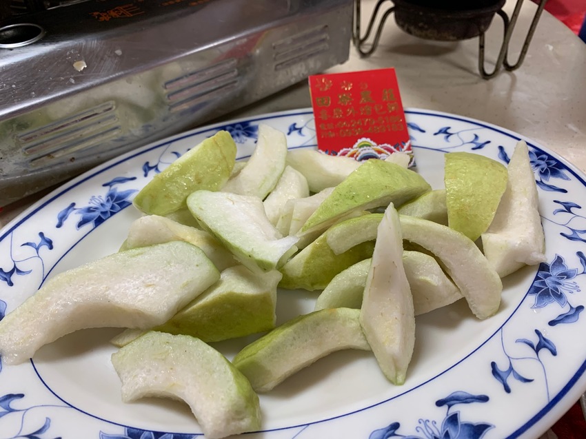 水果是當季的芭樂,甜又脆。紅牌裡面是牙籤,以前流水席都會有這樣的東西,看到還以為是放火柴,要打開才知道是牙籤哦。