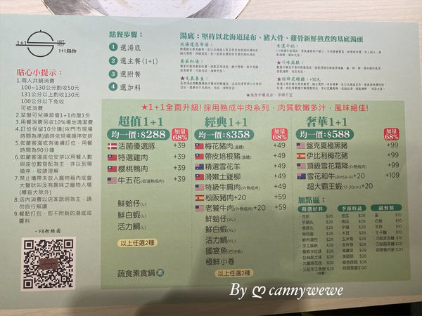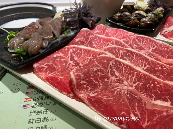 $358,梅花豬肉、帶皮培根豬、精選雪花羊、滑嫩土雞柳、特級牛肩肉 (松阪豬肉、老饕牛肉+$20)可搭海鮮(鮮蛤仔、鮮白蝦、活力鯛、國宴魚、極鮮小卷)